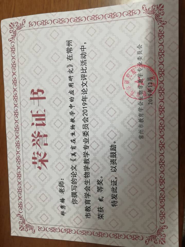 在常州市教育学会生物学教学专业委员会2019年论文评比活动中,郑秀梅老师攥写的论文《美育在生物学教学中的应用研究》荣获二等奖。