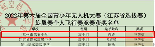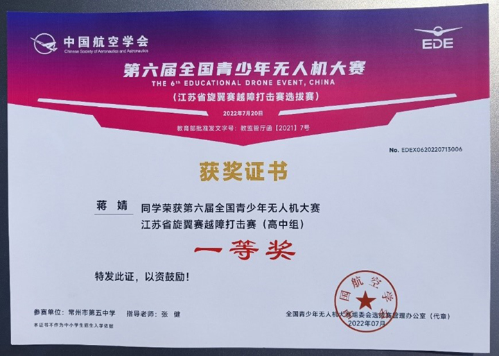 近日,由中国航空学会主办的第六届全国青少年无人机大赛成绩揭晓,我校蒋婧同学荣获江苏省旋翼赛越障打击赛高中组(高中组)一等奖和旋翼赛个人飞行赛(高中组)三等奖。