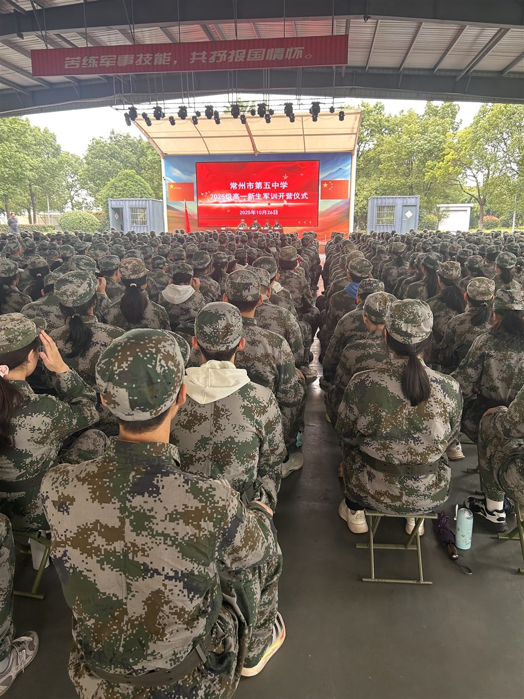 10 月 26 日上午,常州市第五中学高一新生军训启动,高一(7)班 56 名学子身着迷彩服,开启高中 “必修课”。